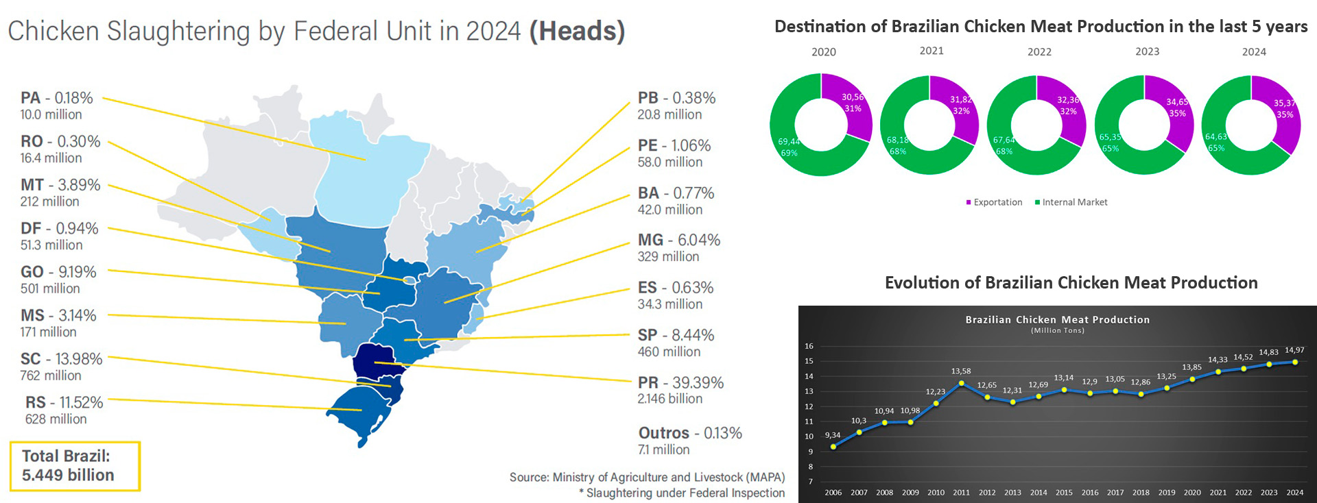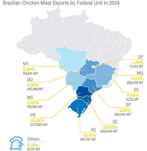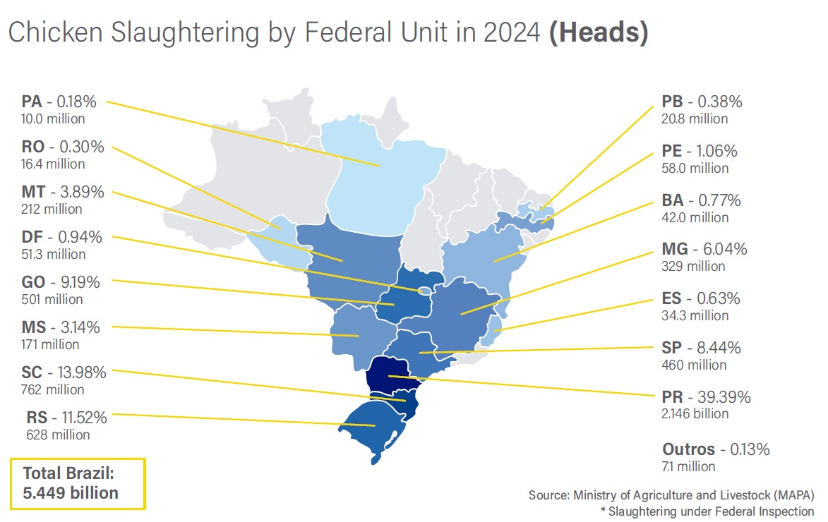 Poultry production generates around 2 million direct and indirect jobs throughout Brazil, contributing to a significant increase in the economy. The south and southeast regions are the largest producers, but there is a growing production in the center-west region due to the production of corn and soybeans. The states that produce the most chicken are the states of Paraná (27%), Santa Catarina (26%) and Rio Grande do Sul (23%).