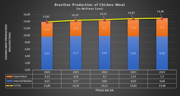 Production of chicken meat reached 14,5 millions tons in 2021, 5% higher than that recorded in 2020, with 13,85 million tons. The volume projected for 2022 could reach up to 14,85 million tons, a volume 2% higher compared to 2021.