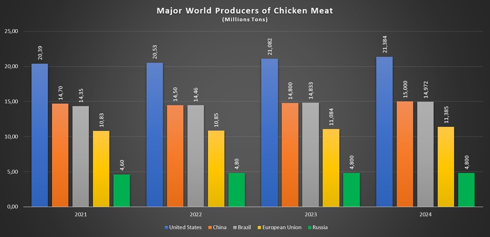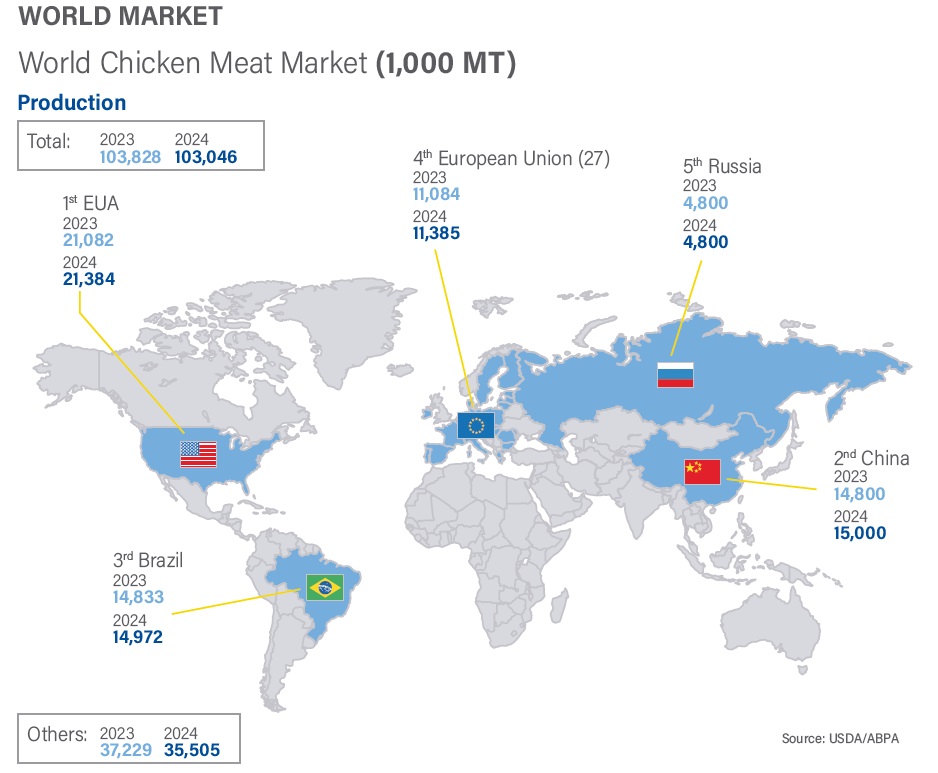 In 2021, China surpassed Brazil in chicken meat production by 200 thousand tons, leaving China in second place in the world ranking and Brazil in third place. The USDA forecasts for 2022 are that Brazil will surpass China in production, estimating a total production of 14.85 million tons, while China would reduce its production from 14.7 million in 2021, to 14.5 million in 2022; Thus, Brazil remains the 2nd largest producer of chicken meat in the world.
