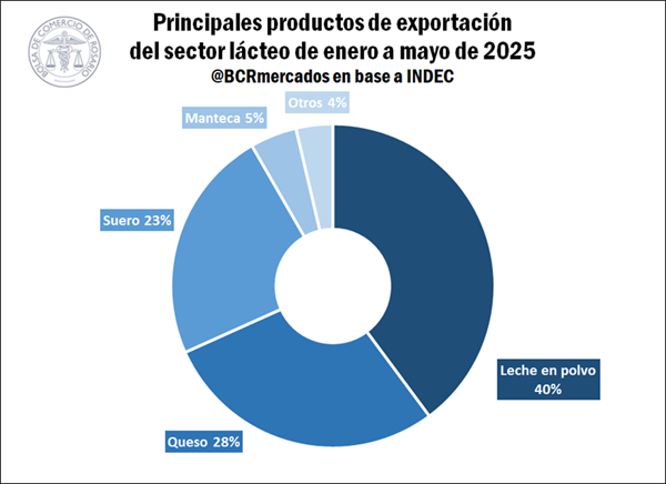 Powder milk was Argentina’s leading dairy export in the first five months of 2025, accounting for 40% of the sector’s total exports. It’s worth noting that powdered milk’s share has declined over the years, having reached 70% of the total at the beginning of the century, and has lost ground to cheese and whey exports. Thus, from January to May of this year, exports of these two products represented 28% and 23%, respectively, of the sector’s total export volume.