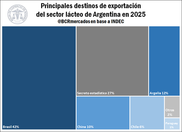 Regarding the destination of exports, it is noteworthy that the dairy export market remained concentrated: in the first five months of the year, 70% of shipments abroad went to just four countries. In fact, the main trading partner for the dairy sector was Brazil, which received 42% of Argentine dairy exports. Algeria followed, with 12% of shipments, while China and Chile accounted for 10% and 6% of exports, respectively. It should be noted, however, that a considerable portion (27%) of the destinations of Argentine dairy exports are unknown due to the application of statistical secrecy regulations by INDEC (National Institute of Statistics and Censuses).