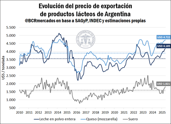 Given the decline in dairy export volume during the first five months of the year, the increase in the value of shipments is explained by a rise in product prices. According to data published by the Secretariat of Agriculture, Livestock and Fisheries (SAGyP), the export price of whole milk powder has been rising over the last year and a half, accumulating a 32% increase since November 2023. Thus, the FOB price of this product in May 2025 is estimated at US$4,185/ton, well above the historical average of US$3,570.